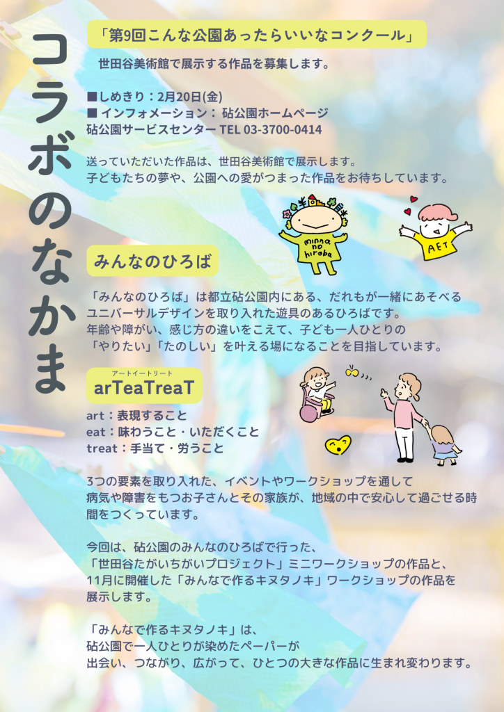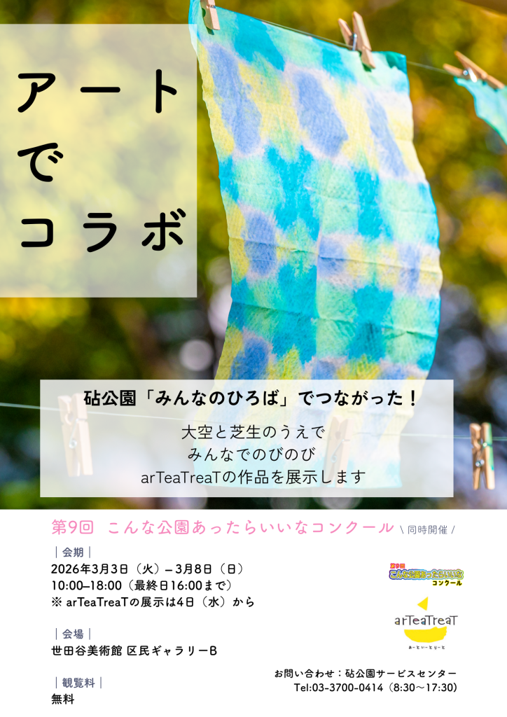 昨年11月に砧(きぬた)公園みんなのひろばで開催した「みんなでアートday」の展覧会が3月4日(水)から始まります